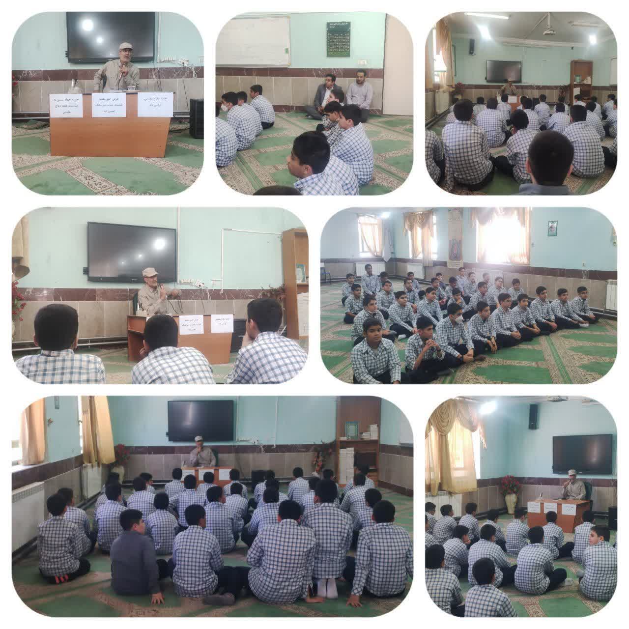 خلاصه: در هفته دفاع مقدس، جلسهای با موضوع "جهاد تبیین جنگ ۱۲روزه" در مدرسه شهید بهشتی برگزار شد. سرهنگ نصیرزاده با بیان خاطرات و تحلیلهای خود، اهمیت آگاهی و مقاومت در برابر جنگهای رسانهای و فرهنگی را برای دانشآموزان تشریح کرد.